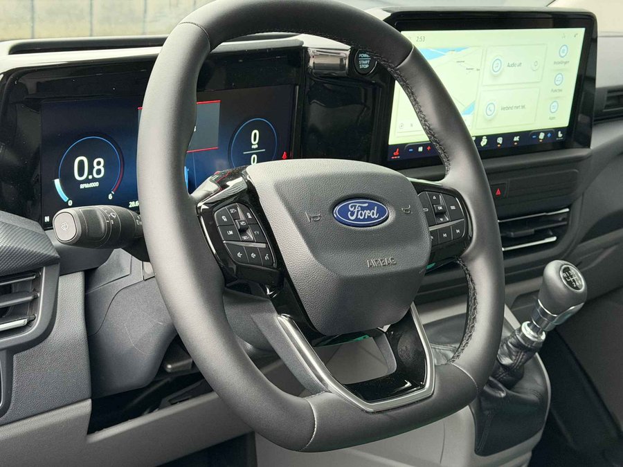 Voor het overzicht tijdens iedere rit is deze Ford Transit Custom voorzien van een gemakkelijk afleesbaar digitaal dashboard. Kommaar-kommaar-kommaar, aldus de achteruitrijcamera. Iedere centimeter vrije ruimte komt haarscherp in beeld. Schadevrij inparkeren maar! Adaptive cruise control houdt de ingestelde snelheid vast en houdt automatisch afstand tot uw voorligger. Als u regelmatig met een aanhanger of een fietsendrager op pad bent, is de afneembare trekhaak een praktische extra. De speciale app verbindt met Connected Services, die de status van vitale functies bijhoudt en waarschuwt als u bijvoorbeeld moet tanken, de bandenspanning moet controleren of olie moet bijvullen. Met navigatiesysteem, WIFI-hotspot, automatische airconditioning, regensensor en centrale deurvergrendeling met afstandsbediening is deze Ford helemaal compleet.